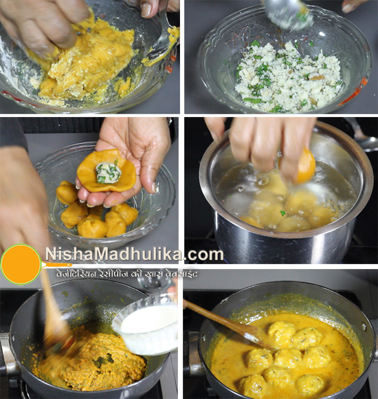 कढ़ाई में तेल डालकर गरम कीजिये, जीरा डालिये, जीरा भूनने के बाद हींग, हल्दी पाउडर, धनियां पाउडर डालिये, और मसाले को थोड़ा सा भून लीजिये, अब टमाटर हरी मिर्च, अदरक पिसा मसाला डालिये और मसाले से तेल अलग होने तक भून लीजिये, बेसन डालिये और लगातार चलाते हुये, 2 मिनिट तक भून लीजिये, अब बचा हुआ आधा मावा, क्रम्बल करके डालिये और 2 मिनिट भून लीजिये, लाल मिर्च भी डाल दीजिये, और थोड़ा सा भून लीजिये मसाला अच्छी तरह भुन कर तैयार, फैटा हुआ दही डालिये और लगातार चलाते हुये भूनते रहिये, जब तक कि उसमें अच्छी तरह उबाल नहीं आ जाता है.