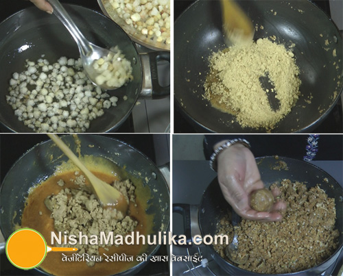 कढ़ाई में घी डालकर गरम कीजिये, थोड़ा घी बचा लीजिये, घी को मीडियम गरम कीजिये और गोंद को धींमी गैस पर भून लीजिये, गोंद फूल कर चार गुने आकार में हो जाता है, भुने गोंद को अलग प्लेट में निकाल लीजिये. बचे हुये घी में आटा डालिये और लगातार चलाते हुये मीडियम और धीमी आग पर ब्राउन होने तक भून लीजिये. भुने आटे को अलग प्लेट में निकाल कर रख लीजिये.
