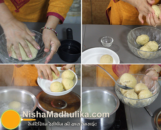 Take 1 liter water in a vessel and place it on flame for boiling. When water starts simmering, place the dough balls into it and cook them for 15 minutes on high flame. After 15 minutes, check the dough balls. For this, insert the knife into the dough balls, it should come out clean. Dough balls are now ready, turn off the flame and take out them out in a bowl.
