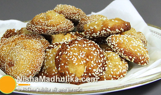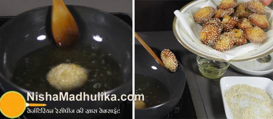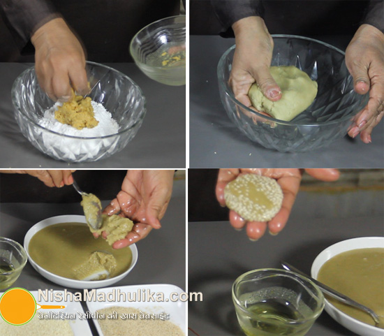 Take ghee in a wok and heat it sufficiently. Grease your hands with some ghee and make a lump from dough. Now roll it giving it a round shape. Dust the dough ball in sesame seeds, roll again and then flatten it slightly. If you are using poppy seeds, then dust it with them in similar way.