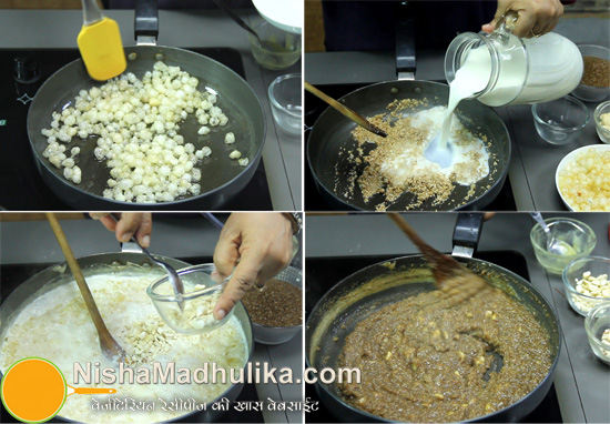 Chop almonds and cashews in small chunks. When milk gets dense in consistency, add roasted gum raisins, chopped almonds, cashews and mix well. Also, add brown sugar. Stir constantly so that milk doesn't stick to the wok.