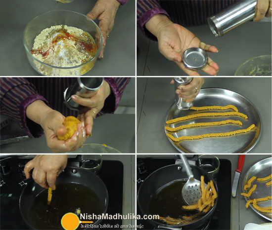 To make soya sticks take sev making machine,Put the star jali, used for making chakli. Fix machine. Grease hands with oil.Break a lump from the dough. Make log, put in machine.
