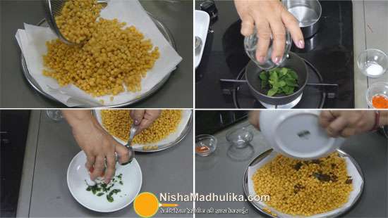 Heat tadka pan, add oil, put curry leaves, roast them until crisp. Take out, keep to cool.Then crush the fried curry leaves and add salt and red chili powder, add more spices if desired. Namkeen Masala Boondi is ready.As it cools keep it in an air tight container. You can use it for over 6 months.