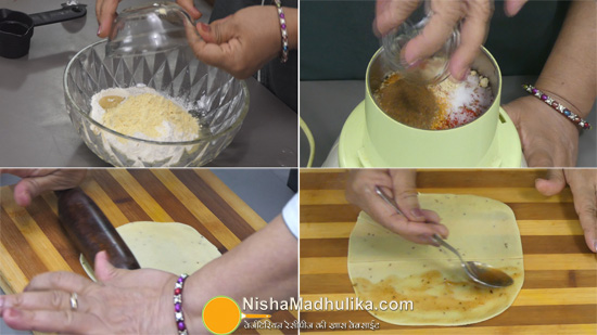 Take the refined flour in a vessel and add 2 tbsp of oil, ⅛ carom seeds, ¼ tsp of salt and 2 tbsp of chickpea flour. Prepare a tight dough using the water. ¼ cup of water is required to prepare this amount of the dough. Cover the prepared dough and keep it aside to set for 15-20 minutes.