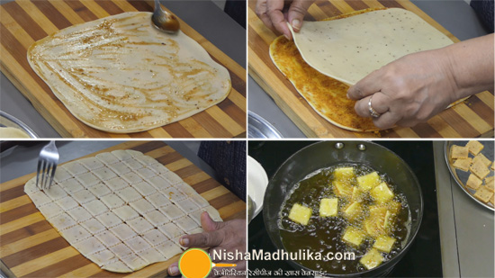 Cut 1-1.25 inches of the square from the stuffed dough and poke it using the fork from both the sides so the bhakarwadi won’t expand. Separate the pieces individually. Practice the same technique on the other portion of the dough. Keep aside the separated bhakarwadi pieces in the open air to set for the 1 hour.