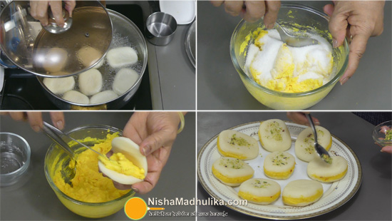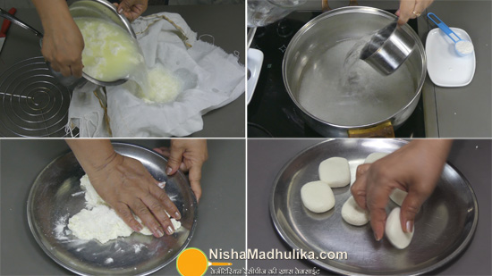 Add the Chena pieces in the sugar syrup when it is boiling and add them in intervals to avoid the disappearance of the boiling point of sugar syrup.