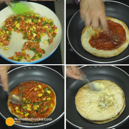 Cook the second round of Kulcha using the same method. Spread a tablespoon pizza sauce over it and spread it evenly. Add the stuffing on it and spread it evenly. Add the grated Mozzarella Cheese and cover it using the another cooked Kulcha. Cook it on the Low- medium flame.