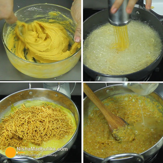 The sugar has now completely dissolved in water. Add milk and ½ cup of roasted mawa in it. Add 1 pinch of yellow coloured food powder and mix it well. Cook the mixture until it boils. Then crush the Sev to add it in the boiling mixture of milk and mawa.