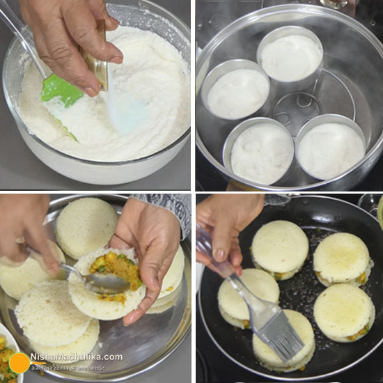 Divide the cooked idlis into two equal halves. Add 1 to 2 teaspoons of stuffing on it and spread it evenly. Place another half over it for covering it. Prepare all the sandwich likewise.