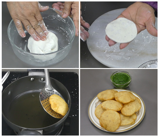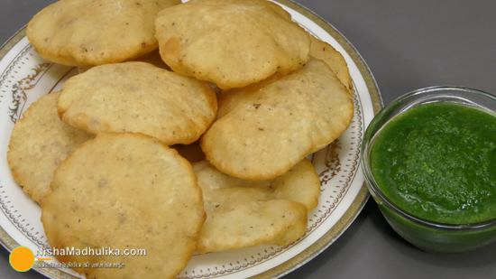 Drain out the fried Poori and place it on a plate. Fry all the Poori likewise and then they are ready to be served. You can serve it along with the Falhari green coriander dip.