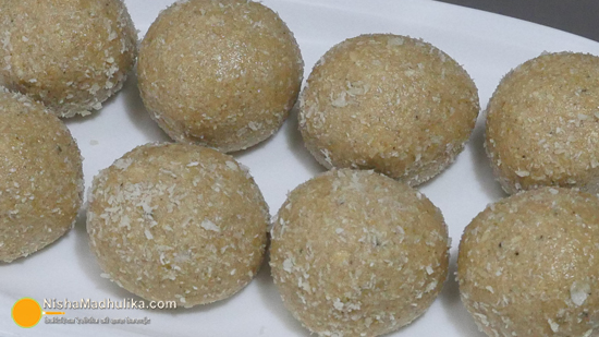 Coat it with desiccated coconut and a Ladoo is ready. Bind all the Ladoos likewise and serve them. You can store these for days too.