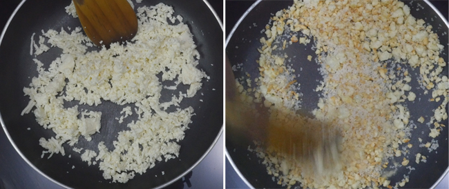 Take ½ cup of fresh paneer and grate it. Once done, sauté the grated paneer over medium flame.