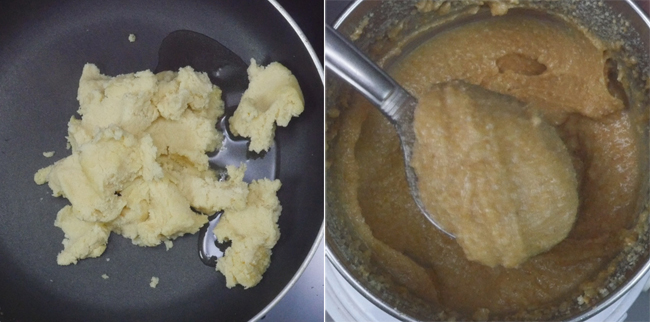Pour the paneer paste in the Mawa pan and turn on the stove. Keep the flame low-medium. Mix and sauté the Mawa and paneer paste together. Sauté until the concoction color changes. And it becomes a little dry.