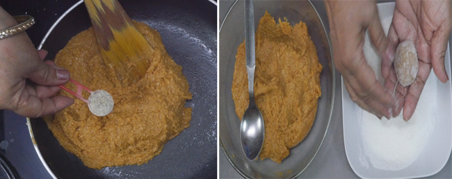 Once the portion of the concoction is cool enough, try making a ball. If it is easy to shape a ball, then the concoction is ready. Add ½ tsp of cardamom powder to the concoction and mix well. Turn off the flame. Transfer the concoction to a bowl and allow it to cool.