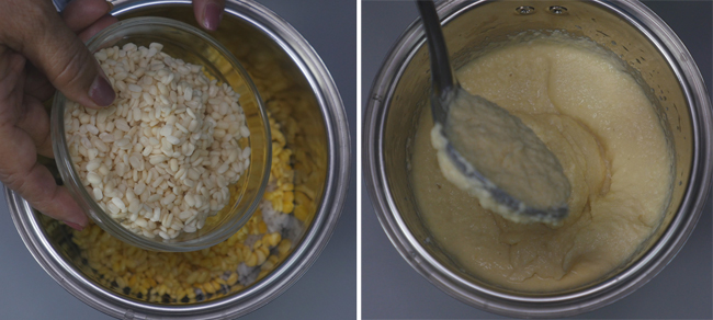 Add ½ cup of soaked rice (of any type), 4 tbsp of chana dal, 4 tbsp of Dhuli Moong dal, 4 tbsp of urad dal, and some water to mixer-blender. Now, blend the contents coarsely. Once done, transfer the rice-dal concoction to a bowl.