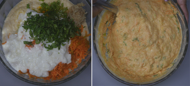 Now, add 1 cup grated Lauki, ½ cup grated carrot, 1-inch grated ginger, 2-3 chopped chilies, 1 tsp of red chili powder, ½ tsp of turmeric powder, 1 tsp of salt, ½ cup curd, ½ lemon juice, 1-2 tbsp of green coriander to the concoction, and mix well.