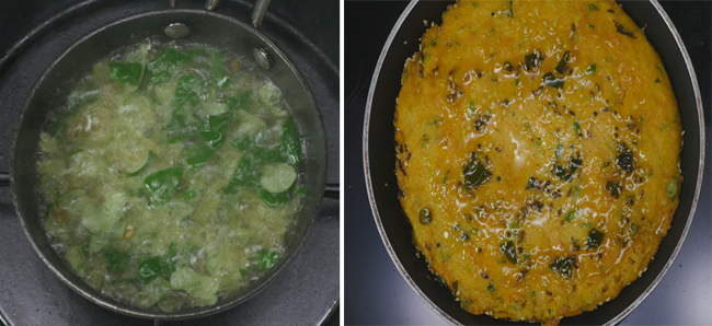 Heat a non-stick pan. Add 2-3 tsp of tadka to the pan and spread it evenly. Pour the batter in the pan and spread it evenly as well. Cover and cook the batter for 10 minutes over low-medium flame.