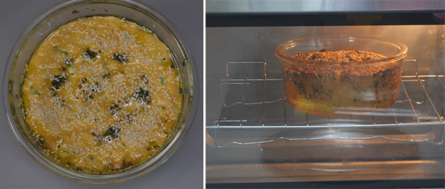 Add the remaining tadka over the batter. Sprinkle ½ tsp of sesame seeds over the batter. Set the oven temperature at 200° centigrade. Put the batter bowl in the oven and bake it for 20 minutes.