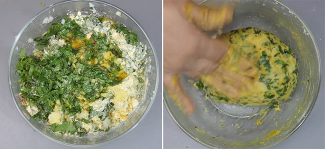 Once the mixture cools down, use your hands to knead the concoction and prepare the dough. Add saved besan and knead again. Apply a little oil on your hand; knead the dough to make it smooth.