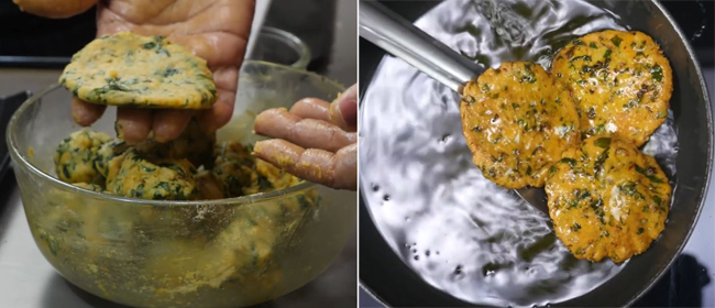 Heat the oil in a Kadhai for frying. On the other hand, break the dough into small equal-sized balls. Apply a little oil in your hands, pick 1-ball, roll, and press (or flatten) it to shape it as Mathri.