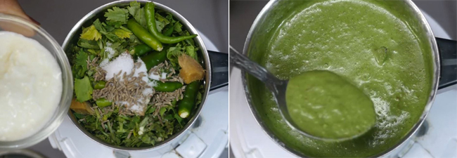 Take 1 cup chopped green coriander, 4-green chilies, ½ inch ginger baton, ½ tsp of salt, ½ tsp of jeera, ½ cup curd and blend them in a mixer-blender.
