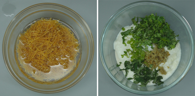 Take ½ cup of roasted vermicelli (Semiya) and soak them in ½ cup of hot water. Cover the vermicelli and keep aside for 10 minutes.
