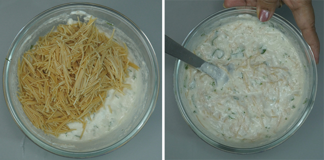 The Sooji has puffed up well, and vermicelli has become soft. Add the vermicelli to the sooji mixture (drain out the water), and mix well. If the batter appears thick, then pour some more water. The batter consistency should not be too thick or runny.