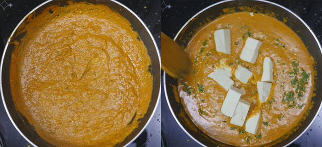 Cut 200 grams of paneer into cubes. Once done, check the gravy. The gravy is all cooked; we will add a little more than ½ cup of water and 2 tbsp of green coriander. Now, add the paneer pieces to the pan. Cover the pan and cook the sabzi for 5 minutes.