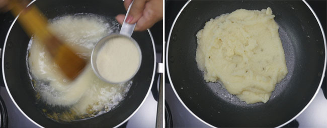 Once the water starts boiling, add 1/2 cup semolina. You can use any type of semolina. Pour and mix the semolina simultaneously to avoid the formation of the lumps. Keep the flame low and cook the semolina while stirring continuously.