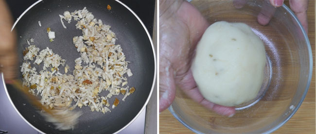 Once the semolina thickens like halwa, turn off the flame. Cover and leave it for 5 minutes. Meanwhile, prepare the stuffing for Pitha.