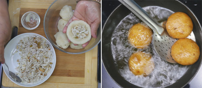 Press the ball between your palms to flatten it. Press the ends slightly, and your Kakara Pitha is ready. Similarly, stuff and ready all the Pithas.