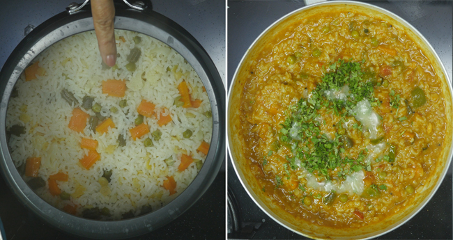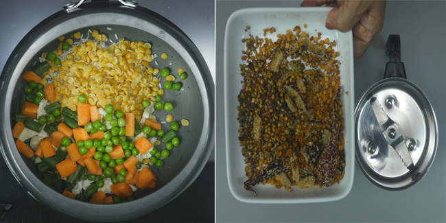Put on the cooker's lid and pressure cooker rice-dal for a whistle. After a whistle, cook rice and dal for 2 mins over low flame. Turn off the stove after 2 minutes, and wait for the cooker's pressure to settle. Meanwhile, we will prepare masala for bhath.