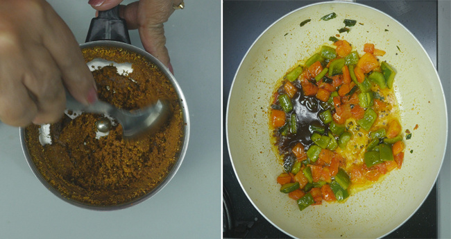 Once the cashews turn brown, take them out and add 1/2 tsp of mustard seeds to the pan. When the mustard stops crackling, add 10-12 curry leaves, 1/4 tsp of turmeric powder, 1-chopped tomato, 1/2 Cup of capsicum to the pan, and saute them lightly.