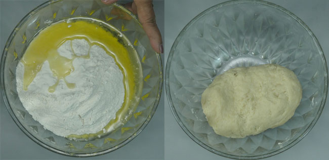To prepare sooji gujiya, we will start with dough preparation. Take 2 cups of maida in a bowl, add 1/4 cup of desi ghee and mix well. Add water gradually and knead a stiff dough. Cover and rest the dough for 20 minutes to set.