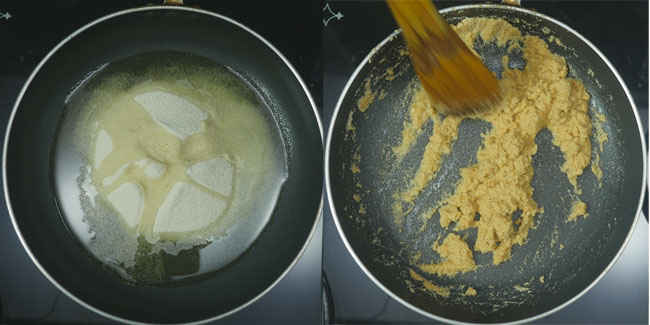 Meanwhile, we will prepare the filling for gujiya. Add 1/2 cup of sooji and ghee (2 tbsp less in half a cup) to a pan. Roast the sooji over the low-medium flame till golden brown.