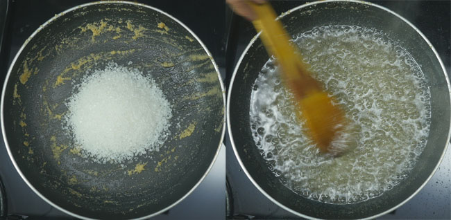 Now, add 1/2 cup of sugar and 1/2 cup water to the same pan. Turn on the flame and simmer the water till the sugar dissolves completely.