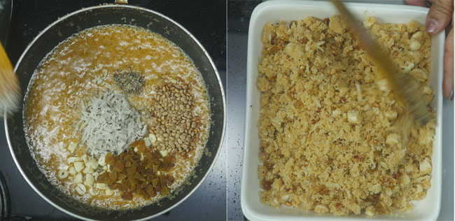 Add 4 tbsp of grated coconut, 2 tbsp of chopped cashews, 2 tbsp of Chizonji, 2 tbsp of raisin (chopped), 5-6 coarsely ground cardamom to the mixture (once it thickens), and mix everything well.