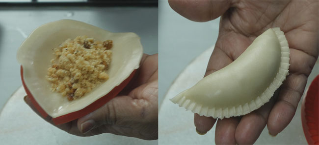 Take a gujiya mold and place the rolled sheet over it upside down. Bring both sides of the mold a little closure and add 1.5 to 2 spoon filling to the center.