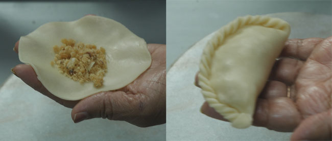 Place the rolled sheet on your palm upside down and add the filling to the center of the sheet. Apply water around the ends of the sheet. Fold the sheet into half moon and stick the edges.