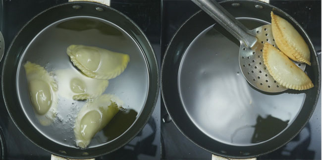 On the other side, turn off the flame and let the ghee temperature reduce. When the ghee is back to less hot than medium, turn on the stove and fry another batch of gujiya.
