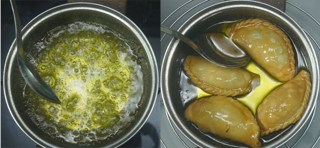 Once the gujiya are golden brown, transfer them directly to the syrup and immerse them in the syrup for 4 minutes.
