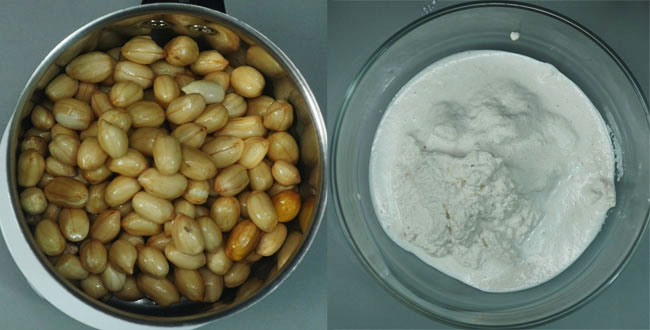 Take 1/2 cup of raw peanuts, wash thoroughly, and soak for 3-4 hours in water. Add peanuts and enough water for blending to the mixer blender.