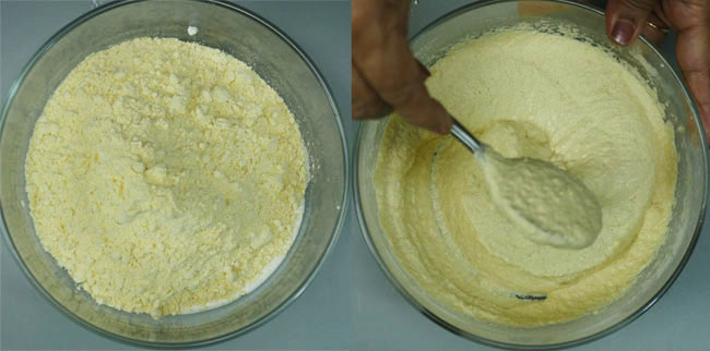 Mix 1 cup of besan in the prepared peanut mixture. Add water gradually and prepare the batter. We need a batter of runny consistency.