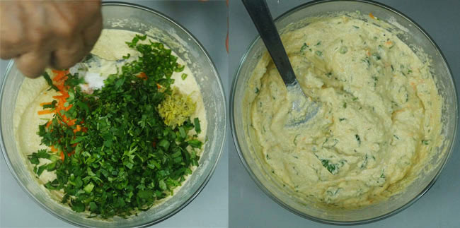 Add 1/4 cup of carrots, 1/4 cup of chopped capsicum, 1 tsp of grated ginger, 2 chopped green chilis, 1/4 tsp of crushed black pepper, a little more than 1/2 tsp of salt, 2-3 tbsp of green coriander to the batter and mix well.