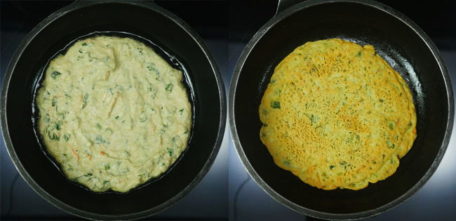 Spread the batter in a circular motion using a spatula and keep the cheela a little thick. Cook covered over low-medium heat for 3 minutes.