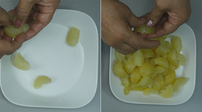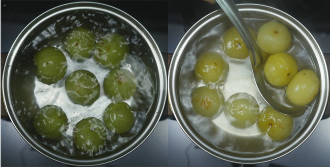 Pour 2 cups of water into a cooking pot and bring it to a boil. Take 250 grams of medium size gooseberries (amla) and drop them in the boiling water.