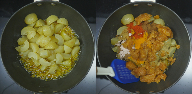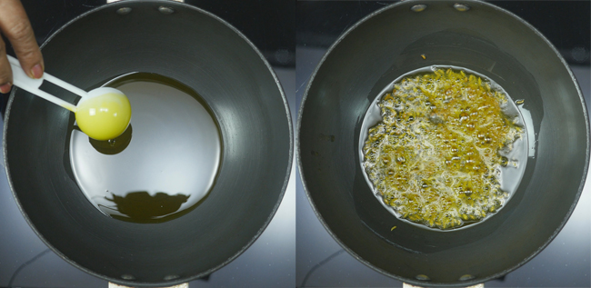 Add 2 tbsp of mustard oil to the Kadai. You can use sesame oil as well and both are good for preparing pickles.