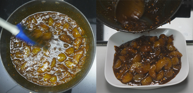 Now, add 3/4 cup of dashed jaggery to the masala for sweetness and mix well. Cook the masala over low heat for 5-6 minutes till the jaggery melts. Make sure to stir the pickle at intervals.