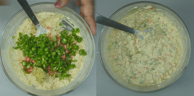Now let's get back to the batter. Add 1/4 cup of chopped carrots, 1/4 cup of chopped capsicum, 1 finely chopped green chili, 1 tsp of grated ginger to the batter and mix well.