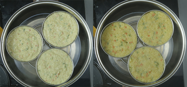Place the batter plate inside the cooking vessel and steam the idlis over medium flame for 12 minutes.